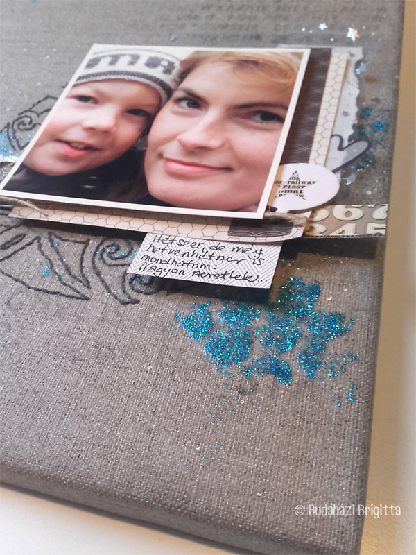 A fotó pontos helyét a vásznon kijelölte maga a képen látható két arc és a vágás (erről sokat szoktam scrapbooktanfolyamon is mesélni). Tudtam, hogy a csillámos festékkel - amit az erőteljes kontrasszteremtés érdekében terveztem használni - a kép közelébe szeretnék majd maszatolni valamit, hogy ott alakítsam ki a fókuszt, ezért, ahová terveztem a fotót, annak vízszintes vonalába halmoztam a díszítőelemeket. Ezt a területet finom festékpöttyözéssel jelöltem ki vízszintesen, amit elsőként vittem fel a vászonra.Fokozatosan figyeltem az egyensúlyra. Ha valahová feltettem egy csillámos foltot, ellensúlyoztam a másik oldalon (függőlegesen és vízszintesen is). Ugyanígy bántam a színekkel is (minden egyes papírnak van egy tónusa, amit a színei és mintázata ad ki), ha ide tettem, akkor a másik oldalra is tettem valamit.